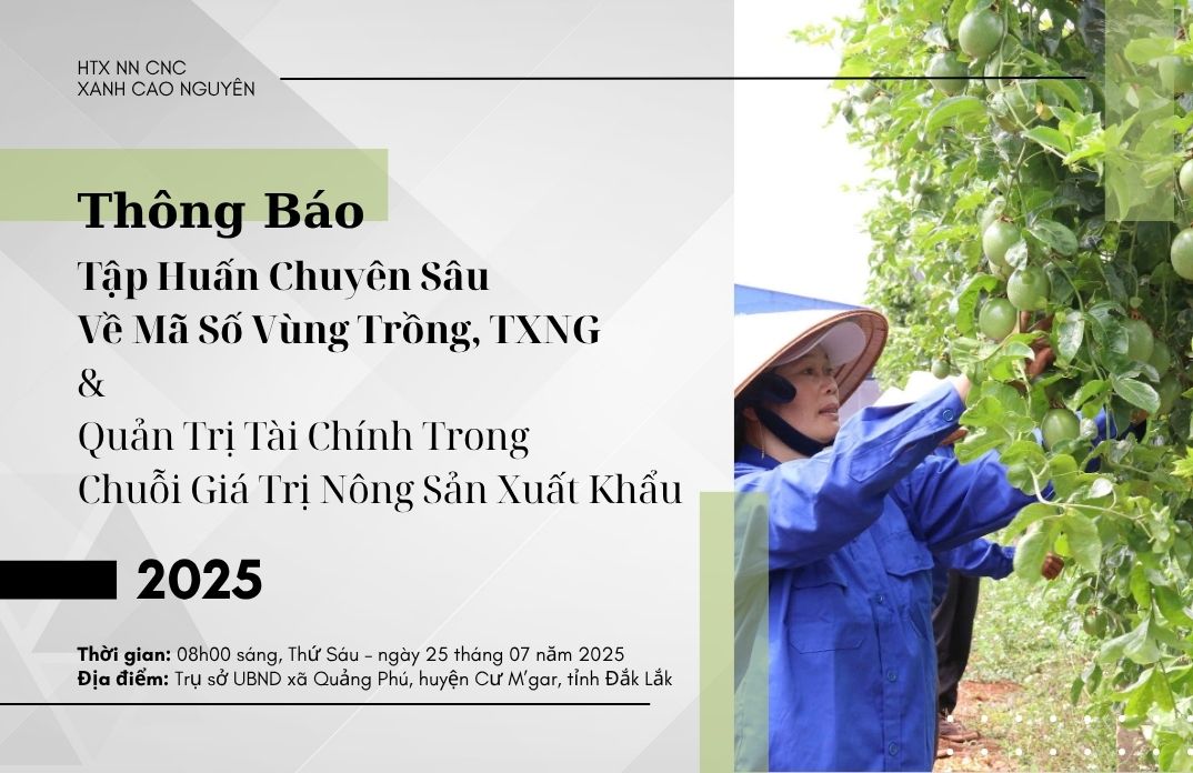 Kính gửi: Quý Cơ Quan, Doanh Nghiệp, Hợp Tác Xã và Các Chủ Thể Sản Xuất Nông Nghiệp Trên Địa Bàn Tỉnh Đắk Lắk! Hợp tác xã Nông nghiệp Công nghệ cao Xanh Cao Nguyên phối hợp cùng các đơn vị chuyên môn trân trọng thông báo về Chương...
